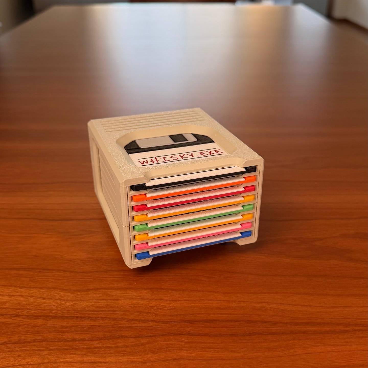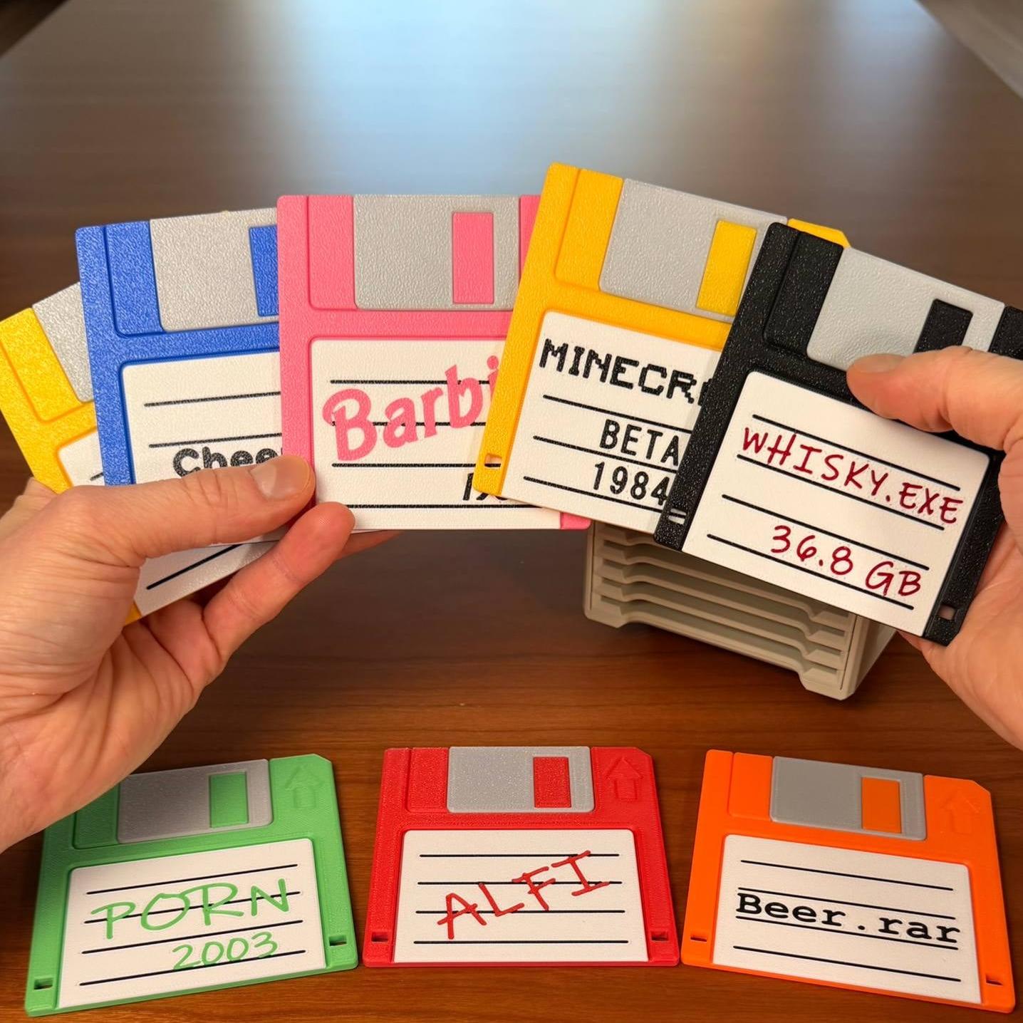 🔷Floppy Disk Coasters: Each coaster is a miniature replica of a 3.5-inch floppy disk, featuring retro-style labels.